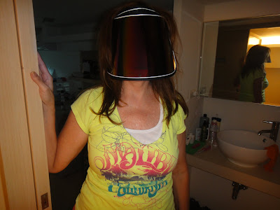 In Taiwan all the women want to hide from the sun all the time so they have these really cool visors that cover your whole face. I almost bought one a long time ago but it was too expensive and Jim pulled the please don't wear that thing around me face, so I didn't buy one. Then one day I went for a walk and I saw another place that had them for sale really cheap, so since Jim wasn't around I bought one. I promised him I wouldn't wear it around him OR I could buy him one too and no one would recognise either one of us. He chose the never wear it around me option. Really is it that bad???